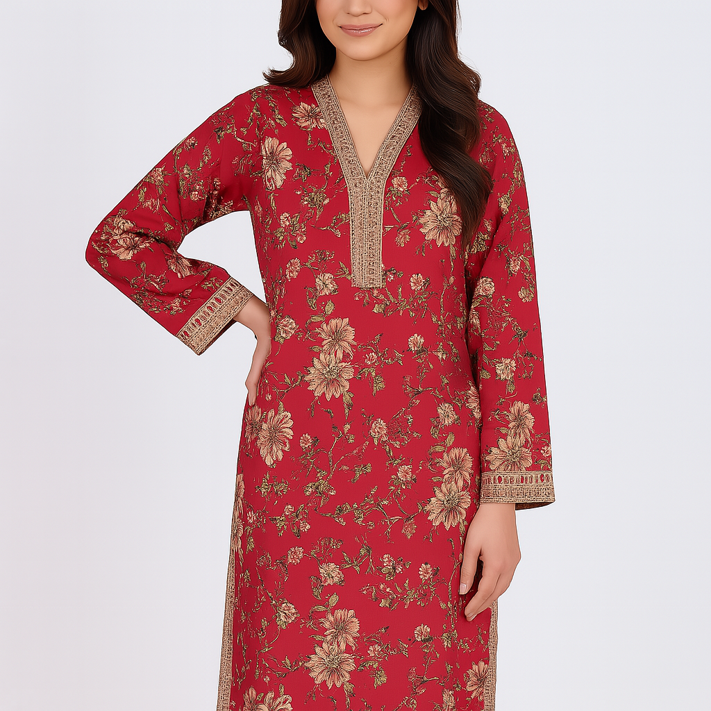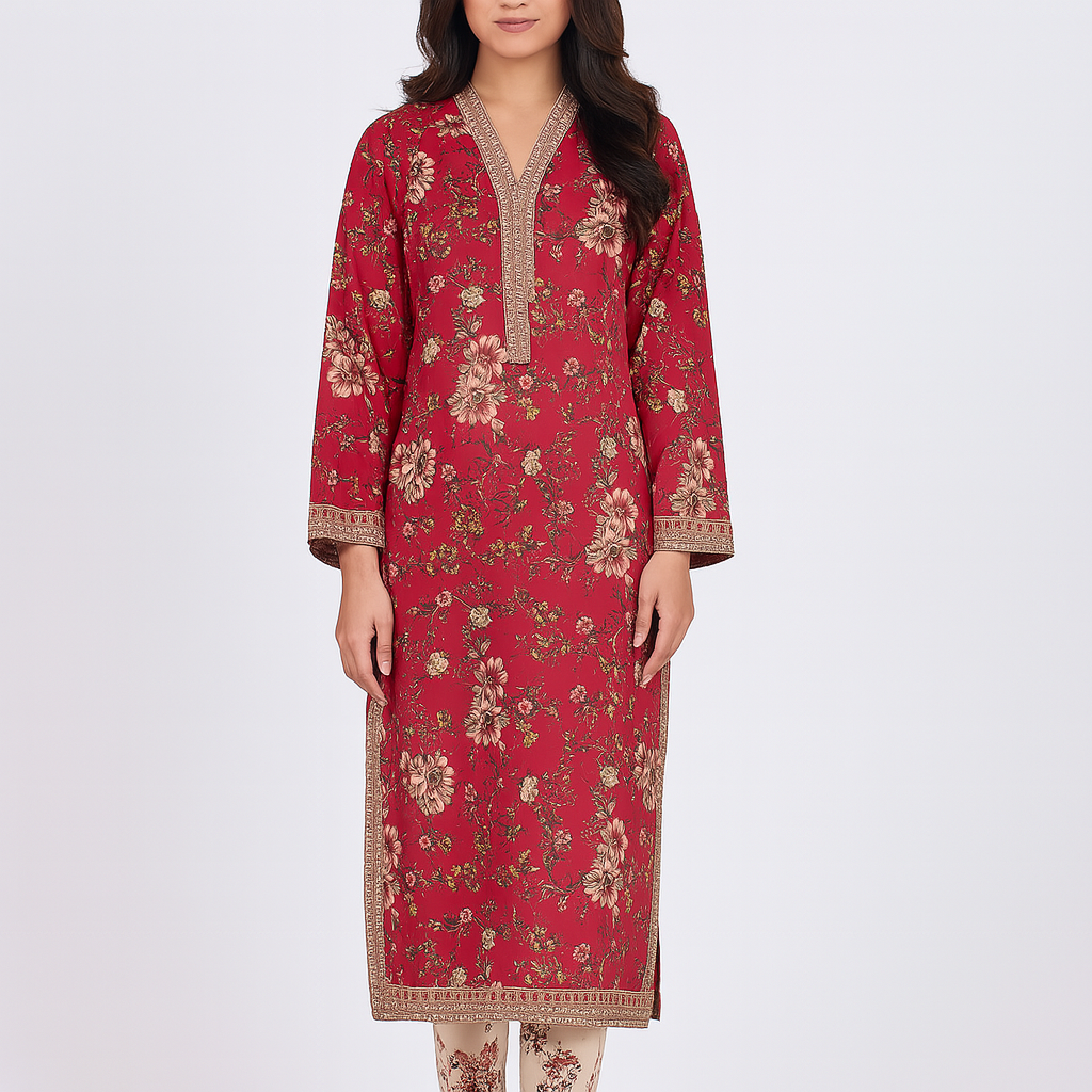 Elevate your ethnic wardrobe with our Crimson Bloom Embroidered Khaddar Kurti, a stunning fusion of tradition and elegance. Crafted from rich khaddar fabric, this deep red kurti is adorned with intricate beige floral prints and delicately embroidered borders that add a touch of sophistication. The V-neckline with detailed threadwork enhances its classic silhouette, making it perfect for both casual and semi-formal occasions. Full-length sleeves and side slits ensure comfort without compromising style. Pair it with trousers or a traditional shalwar to complete your graceful winter look. Ideal for the modern woman who values timeless fashion with a cultural flair.