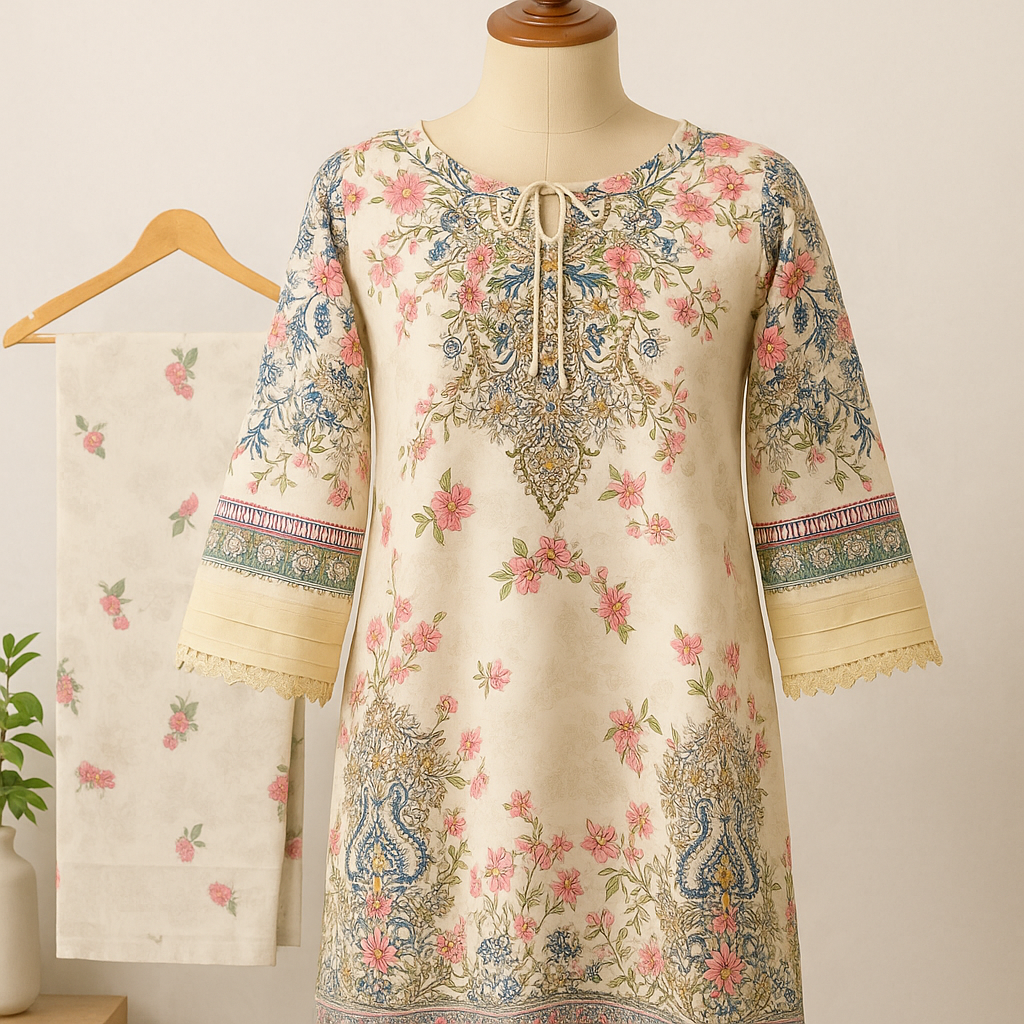 Step into timeless elegance with this exquisite pastel lawn suit featuring delicate floral embroidery in soft pinks and blues. The outfit includes a beautifully embroidered long kurta with intricate threadwork on the neckline, sleeves, and hemline, paired with matching straight pants adorned with subtle floral prints. The ensemble is completed with a coordinating dupatta that boasts a detailed embroidered border, adding a touch of sophistication. Crafted from lightweight and breathable fabric, this suit offers both comfort and style, perfect for daytime gatherings or festive occasions. The muted tones and intricate detailing make it a versatile addition to any wardrobe, effortlessly blending traditional charm with contemporary grace.